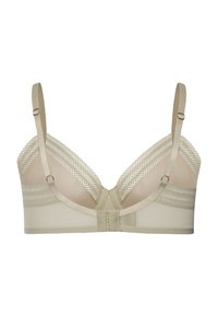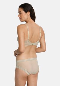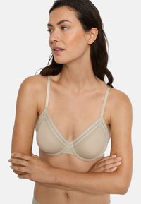 Frau trägt beige BH und passende Unterwäsche mit Spitzenbesatz, steht vor einem einfarbigen hellen Hintergrund.