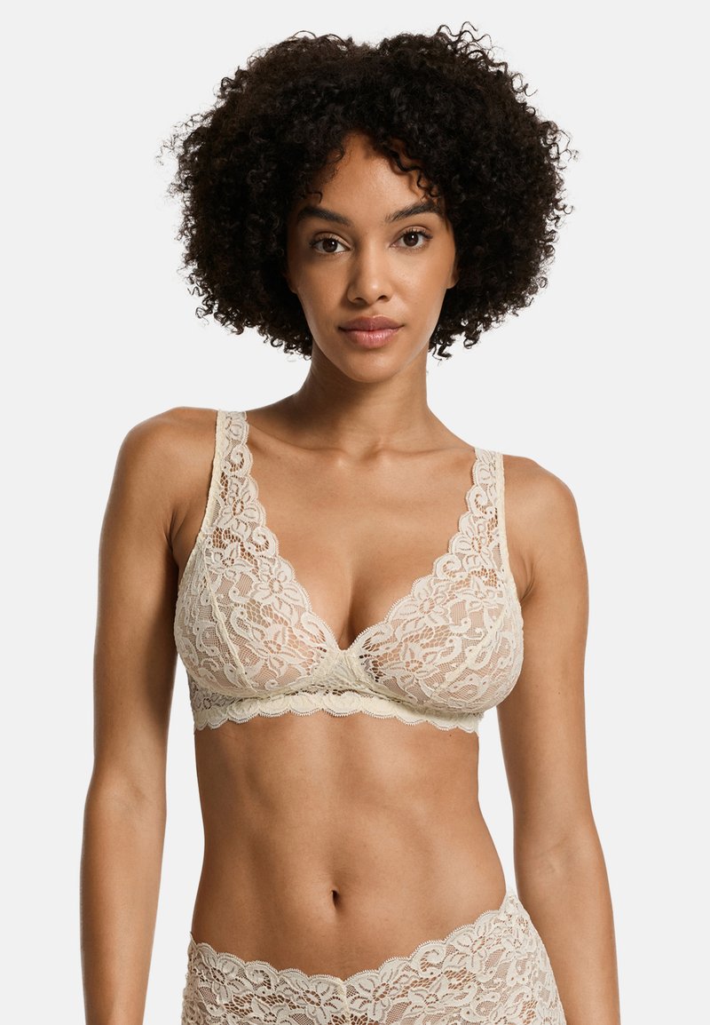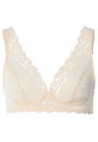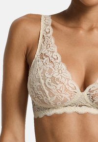 Spitzen-BH in einem hellen Beigeton mit tiefem V-Ausschnitt, gezackten Rändern und breiten Trägern. Durchgehend mit strukturierten Blumenmustern versehen.