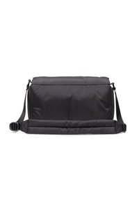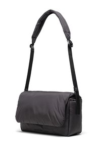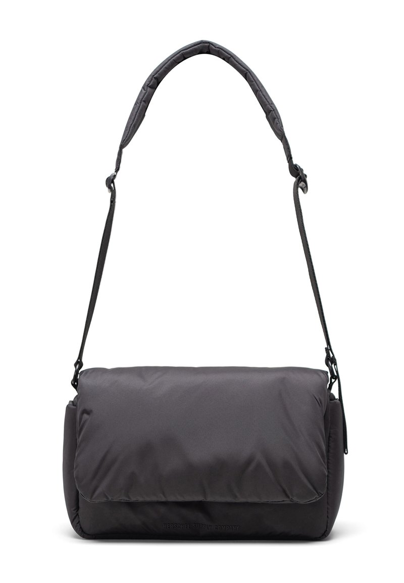 Schwarze, gepolsterte Umhängetasche mit Klappe zum Überklappen, verstellbarem Schultergurt und dezentem Branding auf der Vorderseite. Glattes, langlebiges Material.