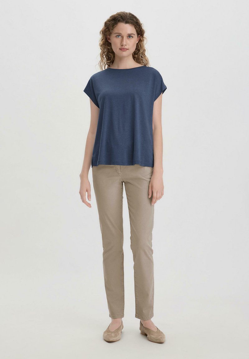 Marineblaues Kurzarmoberteil mit lockerer Passform, kombiniert mit beigen Slim-Fit-Hosen und hellbeigen Slippern. Glattes Material und einfaches Design.
