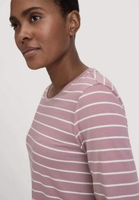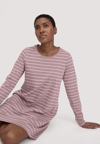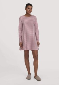 Rosa gestreiftes Langarmkleid mit Rundhalsausschnitt, aus weichem Stoff gefertigt. Kombiniert mit grauen Slippern. Einfaches, lässiges Design.