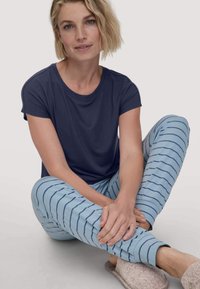 Marineblaues T-Shirt mit kurzen Ärmeln, kombiniert mit hellblauen gestreiften Schlafanzughosen. Die Hausschuhe haben eine weiche Textur in neutraler Farbe.