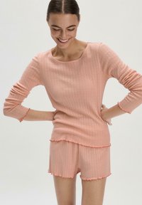 Helle rosa, gerippte Strick-Loungewear-Set, bestehend aus einem Langarmoberteil mit rundem Ausschnitt und Shorts mit gewellten Kanten.