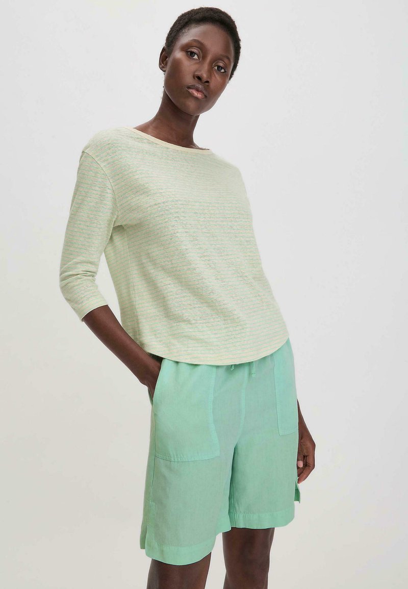 Helles grün gestreiftes Hemd mit Dreiviertelärmeln, kombiniert mit mintgrünen Shorts, die vordere Taschen und einen Kordelzugbund haben.