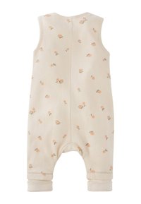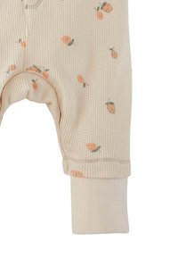 Baby mit blauen Augen liegt auf einer weißen Decke, trägt ein cremefarbenes Outfit mit kleinem Pfirsichblumenmuster und streckt eine Hand nach vorne aus.
