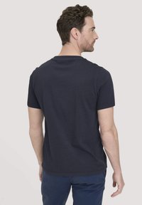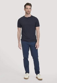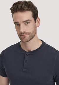 Nachtschwarzes, kurzärmliges Baumwoll-Henley-Shirt mit rundem Halsausschnitt, zwei-Knopf-Blende, glatter Textur und taillierter Silhouette.