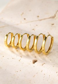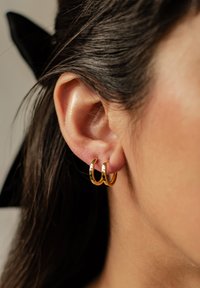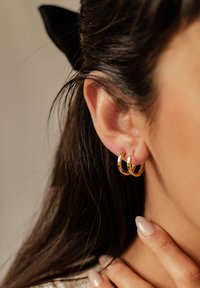Goldene Creolen nahe am Ohr. Glatte Oberfläche mit einem leichten Glanz. Lange, spitze Fingernägel auf der Haut, die die Ohrringe hervorheben.