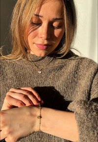 Goldene Kettenarmband mit einem kleinen, sternförmigen Akzent, der drei klare Steine enthält, getragen am inneren Handgelenk auf einem strukturierten, hellen Pullover.