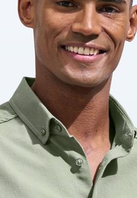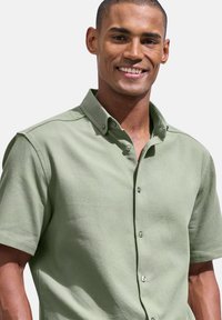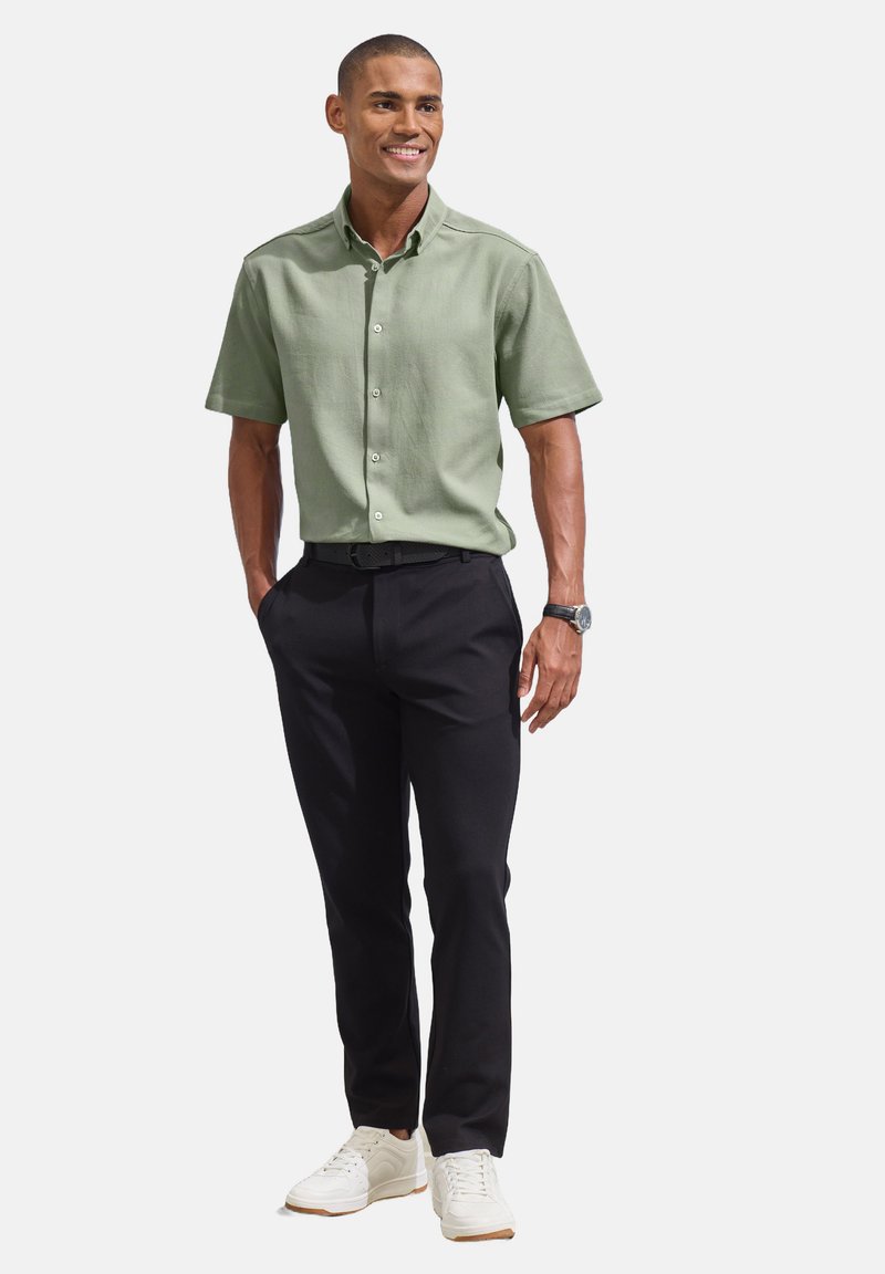 Hellgrünes kurzärmliges Shirt mit Knöpfen, kombiniert mit schwarzen Hosen und weißen Sneakers. Einfaches Design, glatte Textur und lässige Passform.