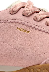 Rosa Wildleder-Sneaker in niedrigem Schnitt mit beigen Akzenten, Schnürverschluss vorne und strukturierter brauner Gummisohle, an der Seite mit "HOFF" gebrandet.
