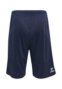 Männliches Model trägt marineblaue Sportshorts mit weißen Chevron-Streifen, kombiniert mit schwarzen Sportschuhen und weißen kurzen Socken auf schlichtem Hintergrund.