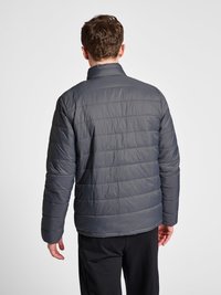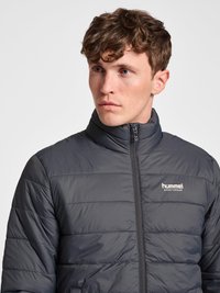 Junger Mann trägt eine schwarze gesteppte Hummel Sportswear Jacke mit den Händen in den Taschen, stehend vor einem einfarbigen hellgrauen Hintergrund.