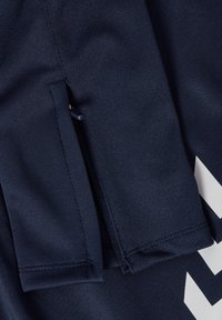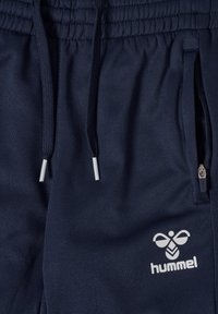 Marineblaue Sporthose mit elastischem Bund und seitlichen Taschen, mit weißem "hummel"-Logo am oberen linken Oberschenkel.