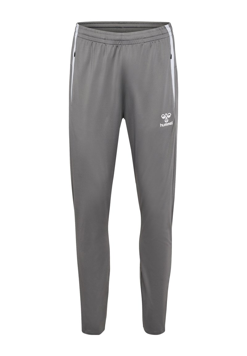 Graue Sporthose mit elastischem Bund, seitlichen Reißverschlusstaschen, weißen Seitenstreifen und Hummel-Logo auf dem oberen Oberschenkel.