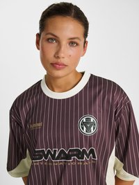 Zwei junge Erwachsene stehen nebeneinander und tragen passende braune Sporttrikots mit feinen Streifen und dem "SWARM"-Logo; einer trägt Shorts, der andere Jeans.