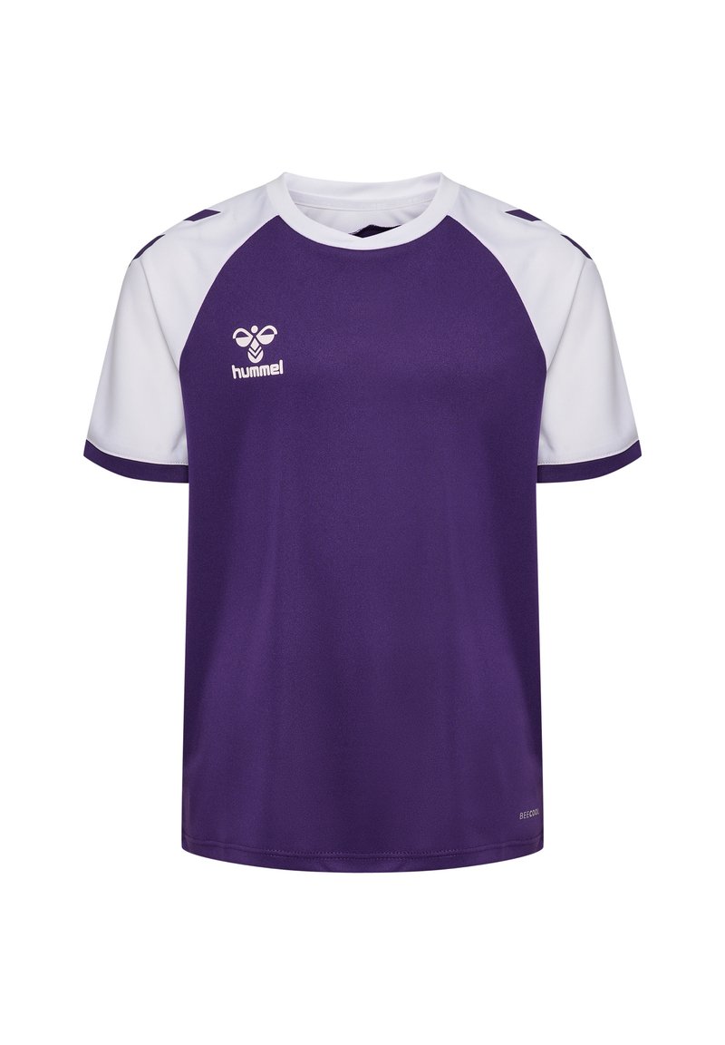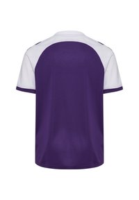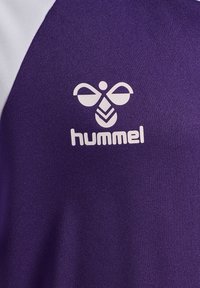 Lila kurzärmeliges Trikot mit weißen Raglanärmeln, ausgestattet mit strukturiertem Stoff und kontrastierendem Besatz. Mit "hummel"-Logo auf der Vorderseite.