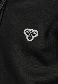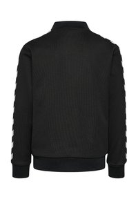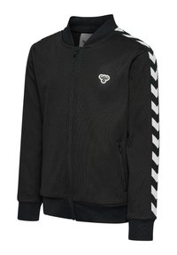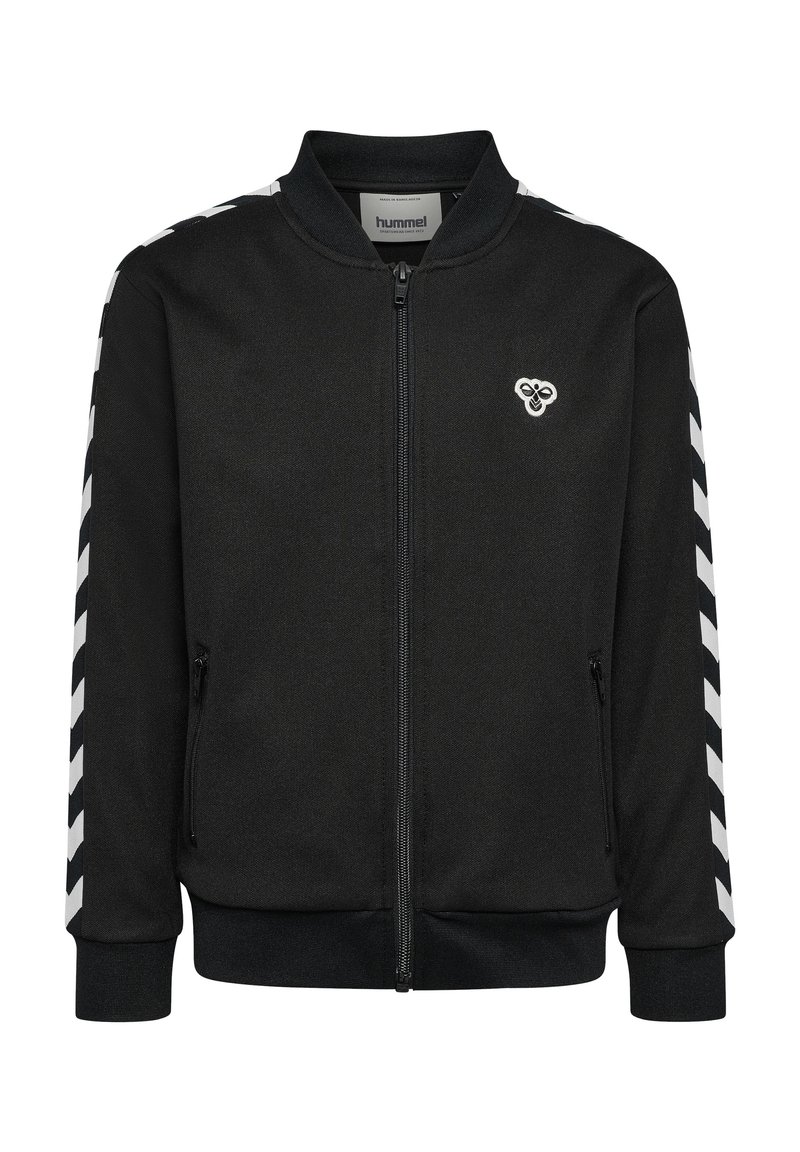 Schwarze Bomberjacke mit durchgehendem Reißverschluss vorne, gerippten Bündchen und Saum, mit weißen Chevron-Streifen an den Ärmeln und einem kleinen Logo auf der Brust.