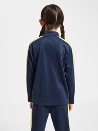 Zwei Kinder stehen in passenden marineblauen und gelben Sportbekleidungen mit halbem Reißverschluss und Hosen, blicken nach vorne vor einem einfarbigen Hintergrund.