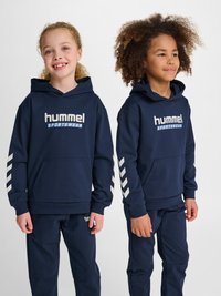 Zwei Kinder tragen marineblaue Hummel-Sporthoodies und passende Hosen und stehen nebeneinander vor weißem Hintergrund.