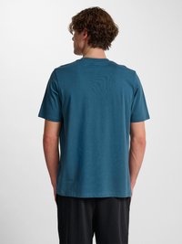 Junger Mann mit kurzen lockigen Haaren, der ein blaues T-Shirt mit kleinem weißem Logo auf der linken Brust trägt und vor einem weißen Hintergrund steht.