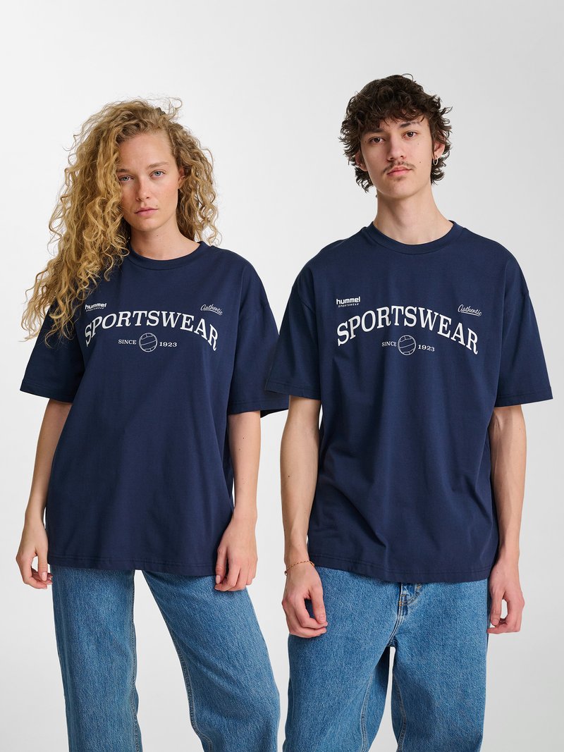 Zwei junge Erwachsene tragen marineblaue „SPORTSWEAR“-T-Shirts und blaue Jeans und stehen nebeneinander vor einem schlichten weißen Hintergrund.