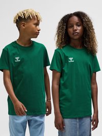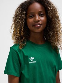 Junge Person steht, trägt ein grünes Kurzarmshirt, einen knielangen Jeansrock mit Frontschlitz, weiße Socken und weiße Sneaker mit Gummisohlen.