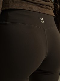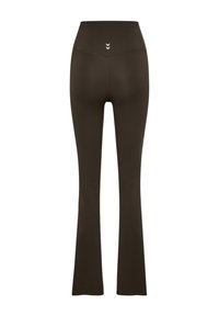 Person, die dunkelbraune ausgestellte Hose und ein passendes Oberteil trägt, steht barfuß auf hellem Hintergrund.