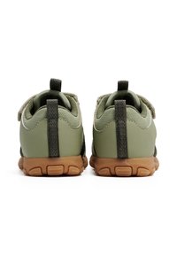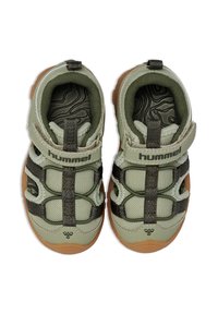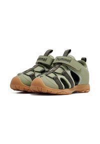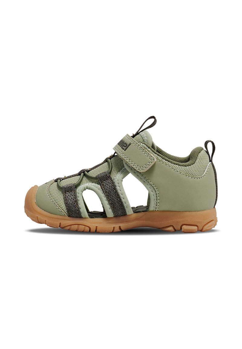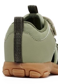 Grünfarbene Sandalen in Kindergröße mit atmungsaktivem Mesh, Gummisohle, Klettverschluss und dunklen Akzenten. Verfügen über eine geschlossene Zehenkappe und ausgeschnittene Seiten.
