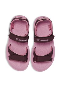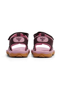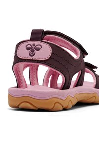Dunkellila und pinkfarbene Sandale mit verstellbaren Riemen, gepolsterter Sohle und einer strukturierten Gummilaufsohle für besseren Halt. Leichtes Design, offene Konstruktion.