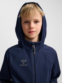 Zwei Kinder in dunkelblauen Kapuzenjacken und passenden Shorts stehen vor einem einfarbigen hellen Hintergrund.