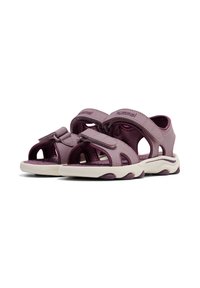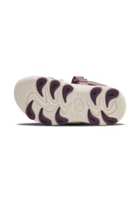 Lila und fliederfarbene Sandalen mit Klettverschlüssen, offenen Seiten und einer weißen, strukturierten Sohle mit wellenförmigem Design. Leicht und atmungsaktiv.