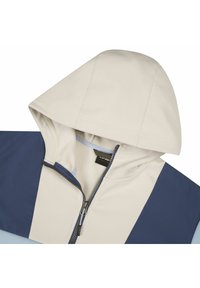 Kapuzensweatjacke mit durchgehendem Reißverschluss, in Beige, Navyblau und Hellblau farblich abgesetzt, mit elastischen Bündchen und Seitentaschen.