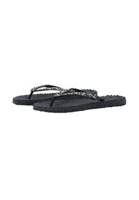 Schwarze gewebte Flip-Flops mit geflochtenen Sohlen und dünnen Riemen, verziert mit kleinen silbernen Perlen, vor weißem Hintergrund dargestellt.