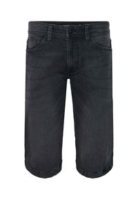 Helle Denim-Shorts in Blau mit geradem Schnitt, umgeschlagenen Säumen, Fronttaschen und dezenten Used-Effekten. Tragen mit weißen Sneakers.