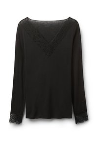 Braunes Langarmoberteil aus weichem Stoff mit einem tiefen V-Ausschnitt und Spitzenakzenten entlang des Ausschnitts und der Ärmelbündchen. Maschinenwaschbar.
