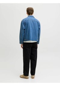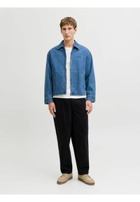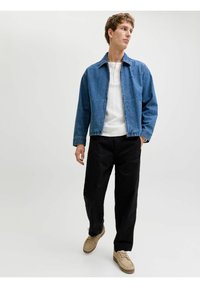 Mann trägt lockere schwarze Hose, beige Schnürschuhe, weißes Hemd und blaue Jeansjacke, steht vor hellem, einfarbigem Hintergrund.