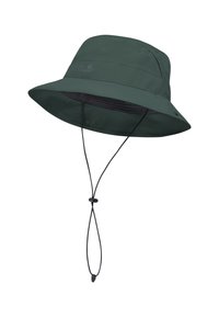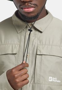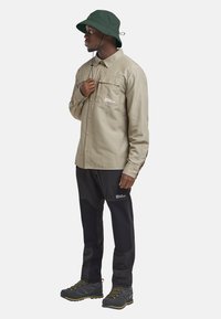 Mann trägt einen dunkelgrünen breitkrempigen Hut und ein beiges Hemd mit Brusttaschen und Logo, die Hände in den Taschen, blickt nach vorne.