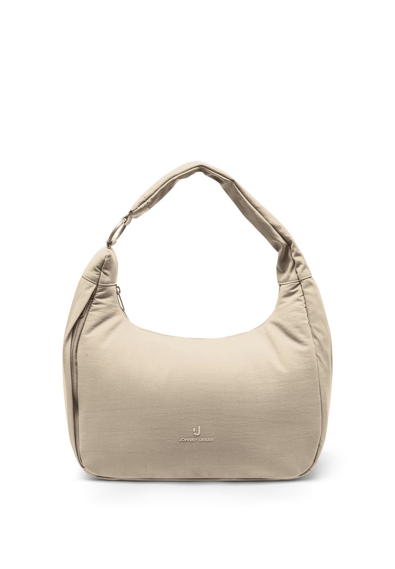 Beige Schultertasche mit gepolstertem Riemen, Reißverschluss und kleinem "Johnny Urban" Logo in der vorderen Mitte.