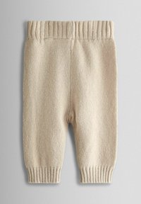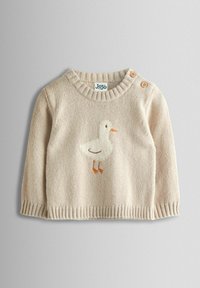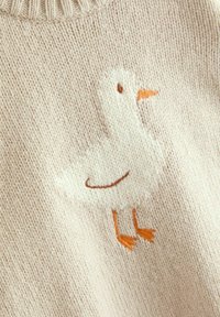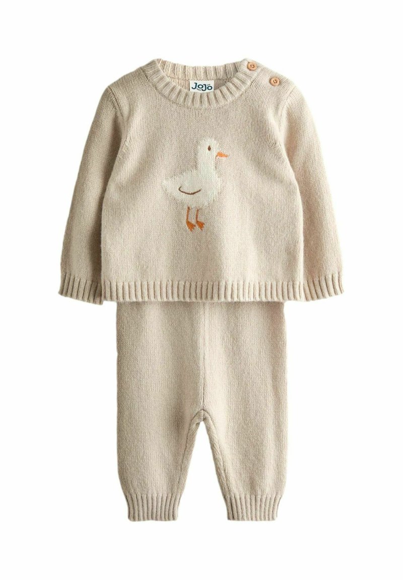 Gestricktes zweiteiliges Outfit in Beige mit einem Rundhals-Pullover, der eine gestickte Ente zeigt, und passenden Hosen mit gerippten Bündchen.