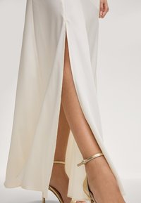 Frau trägt ein bodenlanges weißes Satinkleid mit dünnen Trägern, diagonalen Nahtdetails, einem vorderen Schlitz und goldenen Knöchelriemen-Absätzen.