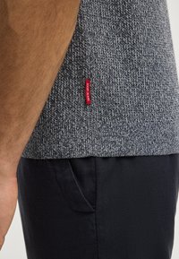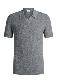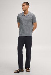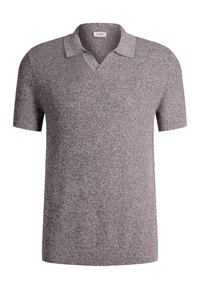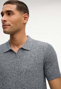 Mann mit kurzen Haaren, der ein kurzärmeliges, graues Poloshirt aus strukturiertem Strick und schwarze Hose vor hellem, einfarbigem Hintergrund trägt.
