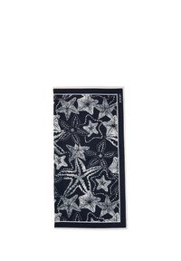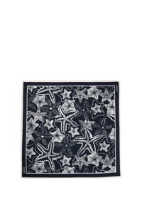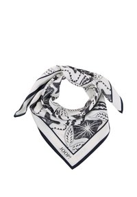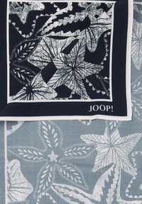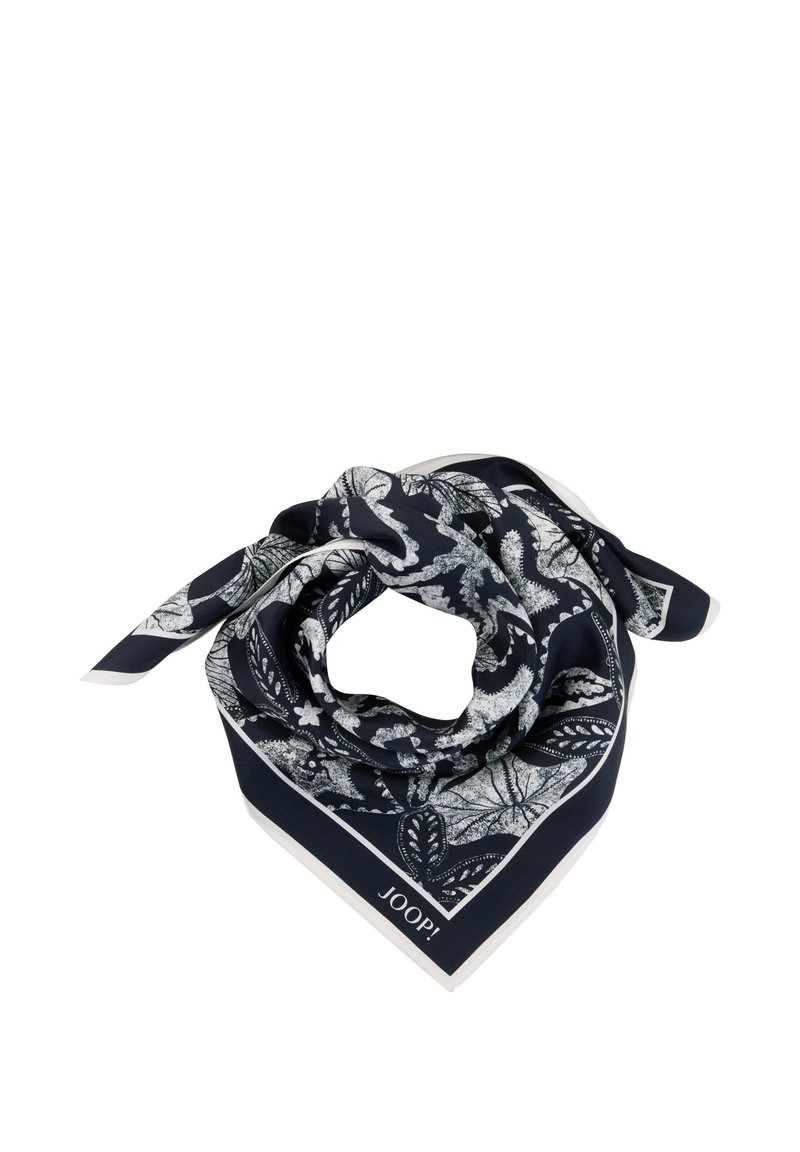 Seidiges quadratisches Halstuch mit marineblauen und weißen botanischen Blatt- und Blumenmustern, gefaltet, mit sichtbarem "JOOP!"-Logo in einer Ecke.