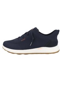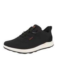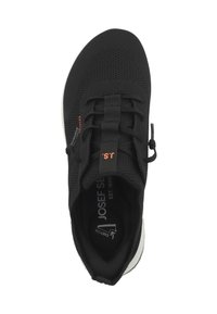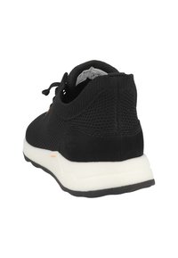 Schwarzer Strick-Sneaker mit weißer Sohle, niedrigem Knöcheldesign und dezenten orangen Nähten an der Seite und auf der Zunge.