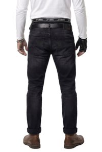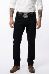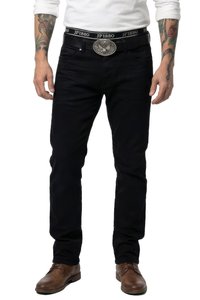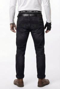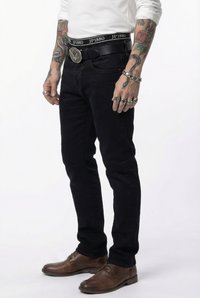 Schwarze Jeans aus Denim mit einer schmalen Passform, ausgestattet mit einem klassischen Fünf-Taschen-Design und einem Knopfverschluss. Tragen Sie dazu schwarze Schnürschuhe.