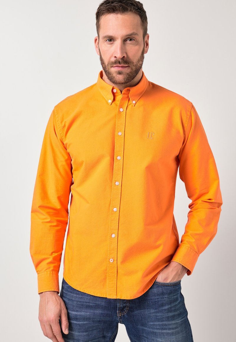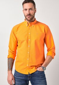 Mann trägt ein knalloranges Hemd mit Knöpfen und blaue Jeans, steht mit einer Hand in der Hosentasche vor hellem einfarbigem Hintergrund.