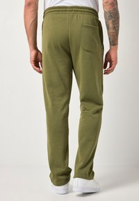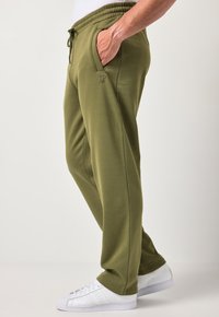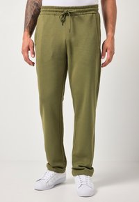 Mann trägt olivgrüne Joggerhosen mit elastischem Kordelzugbund und weißen Sneakers vor schlichtem Hintergrund.