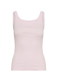 Figurbetontes, ärmelloses Tanktop aus hellblauem Rippstoff. Mit Rundhalsausschnitt und glatter Oberfläche, kombiniert mit dunklen Jeans.