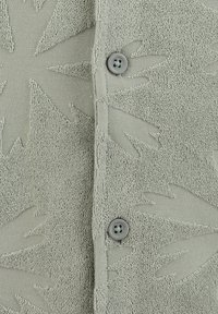 Kurzärmeliges, knöpfbares Hemd in salbeigrün mit strukturiertem Blumenmuster und Camp-Kragen, mit einem kleinen braunen Aufnäher in der Nähe des unteren Saums.