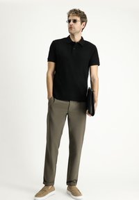 Schwarzes Poloshirt mit klassischem Kragen und kurzen Ärmeln, kombiniert mit beigen Hose. Das Model hält eine strukturierte schwarze Clutch.