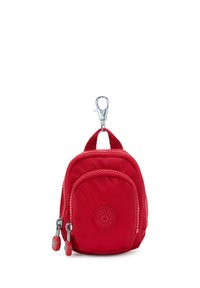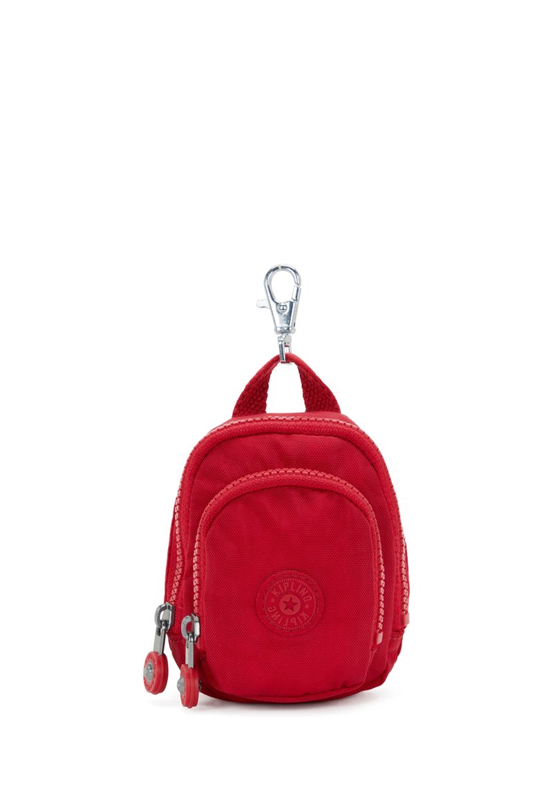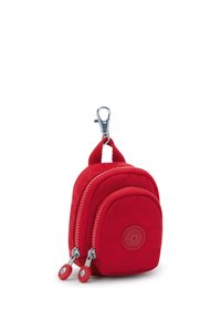 Kleine rote Stofftasche mit zwei Reißverschlussfächern und einem Metallclip zum Befestigen an Taschen oder Schlüsseln.